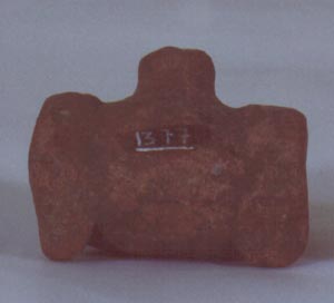 Figurilla Silbato Antropomorfa, tiene un tocado sobre la cabeza y un faldín en la cintura, sontenido con una cinta en el cuello. Donación Carlos Ericastilla.