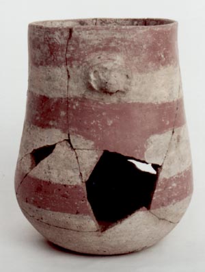 Vaso de pared curvo divergente, base convexa, borde redondeado. Decoración: Efigie zoomorfa en la parte superior y tres bandas horizontales de color rojo. Diámetro máximo 14.6.