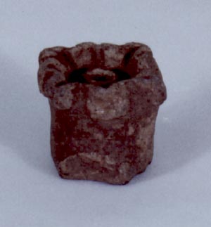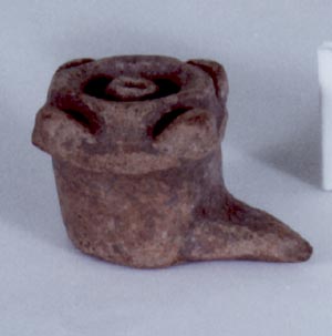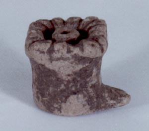 Orejera en forma de zapato. Parte superior cuadrada con acanaladuras y un diseño tubular al centro. Donación: Carlos Ericastilla.