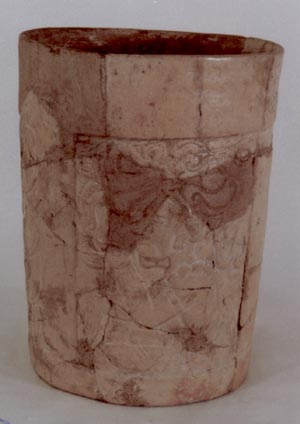 Vaso de pardes recto divergentes y base plana; con dos paneles en alto relieve y dos columnas en forma de serpiente entre cada panel. Cada panel representa una figura humana en posición sentada con los brazos extendidos hacía el frente. Tiene una figura de ave en la parte de atras de la cabeza, cada individuo…