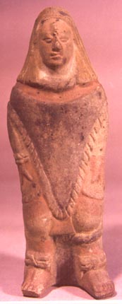 Figurilla silbato, de un prsonaje de pie con los brazos osbre las piernas, vestido con un perraje triangular que sale de arriba de los hombros. Lleva sandalias con una especie de moña cerca de los tobillos. Su cabello es liso. Tiene la boquilla en la parte baja de las piernas, y dos agujeros sobre la…