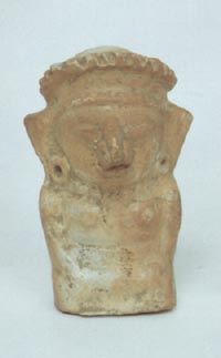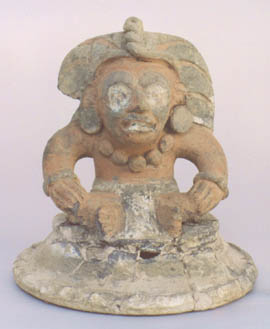 Figurilla moldeada, personaje femenino, hincado con las manos sobre las rodillas, busto descubierto, orejeras, nariguera, tocado en forma de diadema. Vajilla Tiquisate.