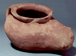 Vasija en forma de zapato, cuerpo globular, alargado del frente, base cóncava, borde evertido, asa ancha del borde al cuerpo. Decoración en la parte alargada lleva diseños de puntos en relieve.