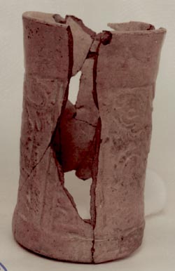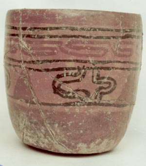 Vaso de pared ligeramente convergente, base cóncava, borde redondeado. Decoración: diseños geómetricos en rojo y negro, sobre un fondo naranja. Préstamo del Dr. Guillermo Mata Amado.