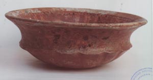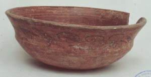 Cuenco de pared curvo divergente, base plana, borde redondeado. Decoración: diseños de puntos rojos en la base, abajo del borde una banda roja, abajo de ella puntos rojos enmarcacos por líneas negras. En el interior, una serie de bandas rojas. El diseño del fondo no se distingue por erosión.