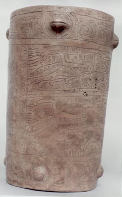 Vaso de pared curvo divergente, borde redondeado. Decoración: dos páneles con diseños en bajo relieve, un personaje sentado de perfil derecho de cuya cabeza sale una voluta, la cual parece sostener con la mano derecha. Lleva tocado en forma de ave, un collar de cuentas, taparrabo.