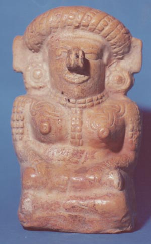 Figurilla hueca vajilla Tiquisate, personaje femenino, en posición sedente. Decoración: orejeras, nariguera, collar en forma de cuadritos, tocado en forma de diadema. El cuerpo tiene diseños incisos, busto descubierto, sobre la espalda el cabello largo, y un diseño de un mono.