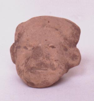 Figurilla hueca, cabeza antropomorfa, personaje obeso, frente arrugada. Sobre la cabeza lleva dos agujeros.
