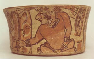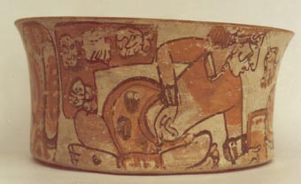 Cuenco de pared recto divergente, borde plano, base plana. Decoración: tres personajes, 2 de perfil izquierdo y uno de perfil derecho. Los personajes están vestidos de similar manera, y tienen tocado grande, collar, pecho y hombros pintados de rojo, taparrabos y muñequeras. Todos están sentados viendo hacia donde se encuentra un cuenco,, con el tributo…