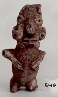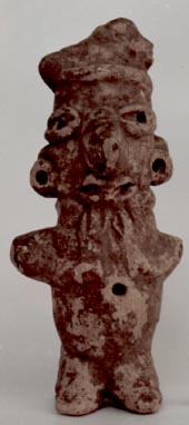Personaje de pie con las manos sobre el pecho, ojos alargados, punzonados, nariz larga, orejeras. Boquilla en el brazo derecho, con un agujero de salida de aire sobre el vientre.