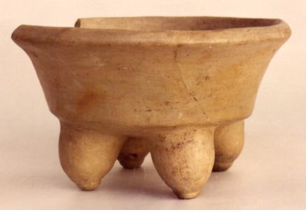 Cuenco de pared ligeramente divergente, borde con bisel externo, base tetrápode. Decoración: soportes mamiformes.