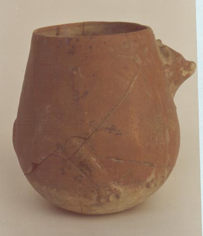 Incensario de pared recta, base plana. Decoración: dos cabezas de serpientes de perfil. Sobre el cuello lleva un collar y tiene dos asas en forma de aletas.