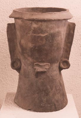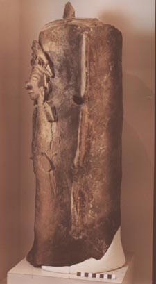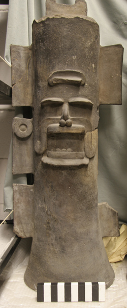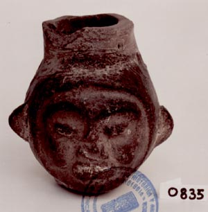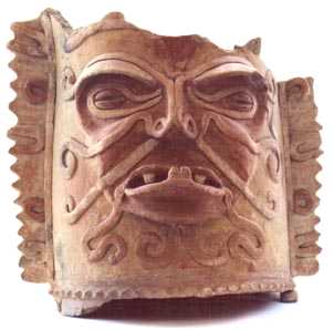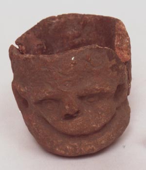 Incensario tubular. Decoración: 6 asas en forma de aleta, rostro antropomorfo, ojos alargados, boca abierta, en la cual se observan 4 dientes, orejeras.