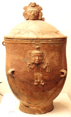 Urna de pared curvo convergente, base pedestal, borde plano. Decoración: personaje antropomorfo en relieve de pie, con taparrabo blanco, collar de cuentas azules, muñequeras. En las manos lleva diseños en forma de frutas. 8 asas. Tapadera con asa antropomorfa, efigie de personaje, con orejeras, boca abierta, tocado en forma de hojas.