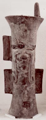 Incensario tubular de tres picos. Decoración: cuatro asas en forma de aletas, ojos alargados, nariz pequeña, de la cual sale un diseño en forma de bastón.