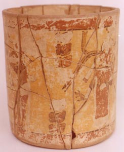 Vaso de pared recta, borde plano, base plana. Decoración: abajo del borde tiene una banda roja y cerca de la base se repite. El diseño principal: personajes de pie conversando. Entre cada personaje se encuentran dos glifos en rojo. Todo el diseño sobre un fondo naranja. No. 0825 de Bishop y Reents-Budet, 1991. Reporte sobre…