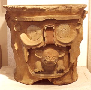 Urna de pared recta, base pedestal, borde evertido. Decoración: jaguar emergiendo de las fauces de un monstruo de ojos grandes, redondos, con iris en forma de bastón.