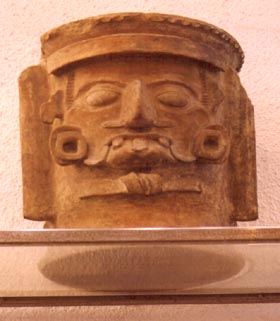 Urna de pared recta, base pedestal, borde plano. Decoración: rostro antropomorfo, de ojos grandes, nariz aguileña, boca cerrada, de la cual salen 3 dientes. Abajo de la quijada tiene un diseño de corbota de mariposa con un nudo en el centro.