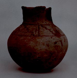 Cántaro de pared globular, base plana, cuello alto. Decoración: diseños incisos en forma de gradas dentro de cuadros. Diseño en inciso grueso.