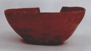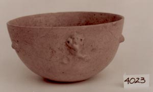 Cuenco de pared curvo convergente, base plana, borde agudo. Decoración: cabeza de ave, de pico largo, con ojos punzonados, y dos asas simulando las alas.