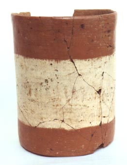 Vaso de pared recta, base plana, borde plano. Decoración: abajo del borde, una banda roja, abajo una banda blanca.