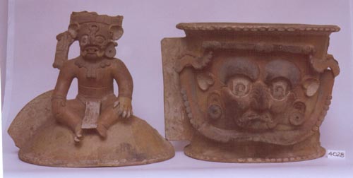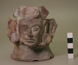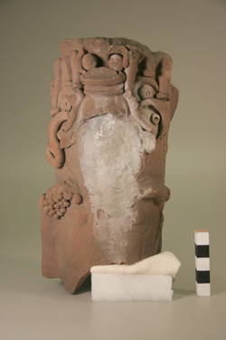 Incensario de pared recta, base pedestal, base plana. Decoración: rostro antropomorfo en relieve, con boca y ojos cerrados, orejeras, dos asas en forma de aleta.