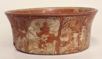 Cuenco de la pared ligeramente curvo divergente, base plana, borde plano. Decoración: escena de personaje antropomorfo conversando con una ave, ambos sentados. Atrás del personaje antropomorfo hay una serpiente en negro, seguida por un glifo en blanco, rosado y negro, separado por una serie de tres glifos en naranja sobre un fondo rosado. El siguiente…