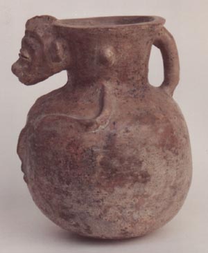 Cántaro de pared ligeramente globular, base cóncava, borde plano, cuello corto. Decoración: efigie zoomorfa en relieve, con las manos sobre lo que puede ser el vientre. Se observan los genitales masculinos y a los lados una protuberancias en forma de púa. En la parte posterior de la cabeza hay un asa.