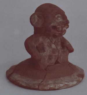 Tapadera miniatura de urna, con un jaguar en la parte superior, sentado con las manos sobre las rodillas, boca abierta, en la cual se aprecian los colmillos, orejas pequeñas. La parte superior del borde se encuentra pintada de blanco.
