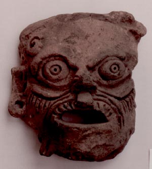 Máscara antropomorfa, con ojos redondos, nariz pequeña, boca abierta, mejillas arugadas, orificios para orejeras. Al lado de la frente tiene un diseño de voluta. Rostro de anciano.