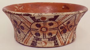 Cuenco de pared ligeramente curvo divergente, base plana, borde redondeado. Decoración: borde pintado de negro, abajo del borde y cerca de la base una banda descontinua de color blanco y negro, en el centro de estas bandas, varios páneles con diseños de posibles glifos repetitivos, unos en blanco sobre fondo rojo, delineado en negro, otros…
