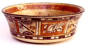 Cuenco de pared curvo divergente, base plana, borde redondeado. Decoración: borde pintado de rojo, abarca parte de la pared, abajo de ella una serie de glifos en rojo, delineados en negro, enmarcados por 4 líneas delgadas rojas, dos arriba y dos abajo. En la parte interior lleva el mismo diseño de banda roja, seguida por…
