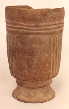 Vaso de pared recta, base pedestal, borde redondeado. Decoración: tres molduras horizontales abajo del borde, dos páneles con 5 acanaladuras verticales.