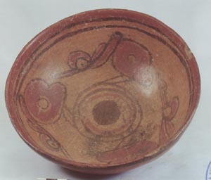 Cuenco de pared curvo convergente, base plana, borde agudo. Decoración: borde pintado de negro, abajo una banda de diseños en forma de herradura en rojo, enmarcadas por dos bandas horizontales rojas, abajo una serie de rectángulos en negro, de los cuales salen bandas rojas delgadas que convergen en la base. Todo el diseño se encuentra…