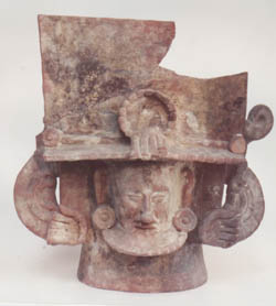 Incensario, base pedestal, borde plano, pared recta. Decoración: rostro antropomorfo, con orejeras, nariguera, collar de cuentas, que da la impresión de ser barba. Las asas forman las manos. En la parte superior de la cabeza tiene una aleta con diseños de pastillaje.