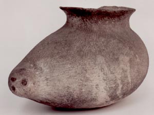 Cántaro con forma de zapato, pared subglobular, base cóncava, borde evertido agudo. Decoración: 3 puntos en la punta de la pieza.