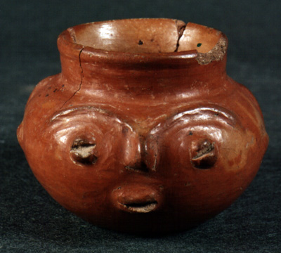 Cantaro miniatura, vajilla Usulután con cara antropomorfa en el cuerpo, engobe naranja, pulido, cuello divergente, cuerpo globular, base ligeramente convexa.