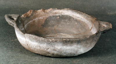 Cuenco con asas perforadas, base plana y paredes curvas. Color café sin engobe. Presenta intervenciones de restauración y faltantes en el borde.