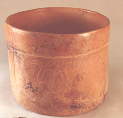 Vaso naranja, labio redondeado, pared recta, base plana. Decoración: una acanaladura debajo del borde, tres diseños acanalados, equidistantes, en forma de un posible sapo.