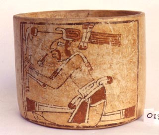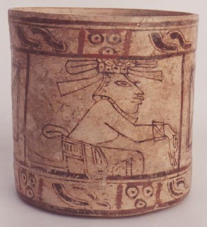 Vaso de pared recta, base plana, borde redondeado. Decoración: dos páneles, los cuales llevan un personaje sentado con las manos hacia arriba, tocado en forma de corona. El segundo personaje tiene las manos hacia abajo. Los personjes están delineados en negro. En la parte superior e inferior de cada pánel aparecen diseños de líneas onduladas…