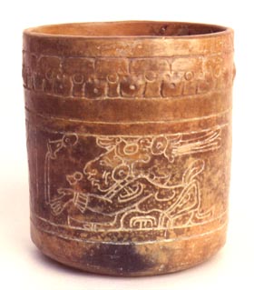 Vaso de pared recta, base plana, borde redondeado. Decoración: diseño de mono, atrás de él una cabeza de ave, abajo del borde una serie de glifos en rojo, delineados en negro.