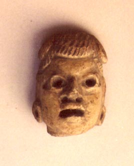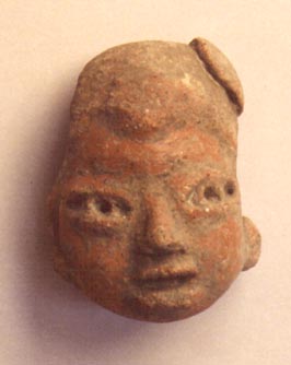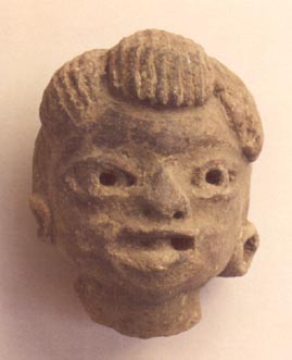 Cabeza antropomorfa, con ojos punzonados, boca abierta, orejeras, cabello colocado sobre la frente.
