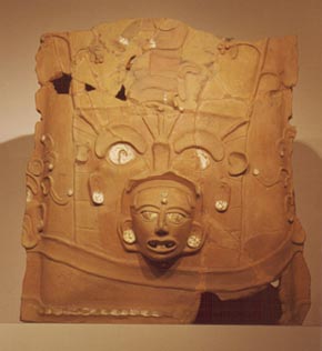 Urna rectangular de pared recta, base pedestal. Decoración: rostro antropomorfo emergiendo de las fauces de otro personaje antropomorfo, de ojos blancos, pupilas en forma de bastón, orejeras blancas. El personaje que emerge tiene ojos protuberantes, boca entreabierta en la cual se observan 5 piezas dentales, y lleva dos aplicaciones en forma de botón sobre la…
