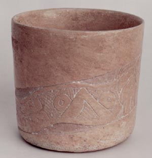 Vaso de pared recta, base plana, borde plano. Decoración: líneas incisas abajo del borde y cerca de la base, diseños zoomorfos en la pared de monos, difícil de distinguir por erosión.