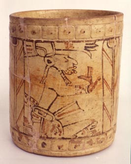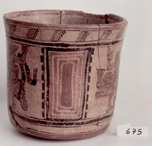 Vaso de pared recta, borde redondeado, base plana. Decoración: banda negra abajo del borde, seguida por una línea delgada, el diseño se repite cerca de la base. Dos diseños representando posiblemente al dios “K”, separados por tres cuadros colocados verticalemte, delineados en negro, y dentro del cuadro un diseño de cruz enmarcado con rojo.
