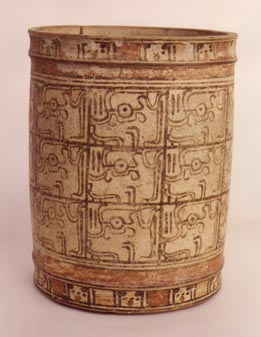 Vaso de pared recta, base plana, borde plano. Decoración: diseños cuadriculados en negro, dentro de los cuales se observan posibles rostros zoomorfos, abajo del borde una banda de cuadros con puntos negros y rojos, abajo de él una banda roja, el diseño se repite cerca de la base. No. 0796 de Bishop y Reents-Budet, 1991.…