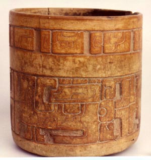 Vaso de pared recta, base plana, borde redondeado. Decoración: abajo del borde diseño exciso de glifos alrededor. Diseño principal: posiblemente la representación del dios “K”, exciso.