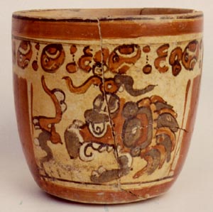Vaso de pared recta, borde redondeado, base plana. Decoración: diseños en forma de gancho abajo del borde en negro. El diseño principal: dos páneles del dios “K” con nariz larga, al final de la nariz una cruz, se encuentra sobre un fondo rojo, delineado en negro con fondo crema. Los páneles se encuentran separados por…