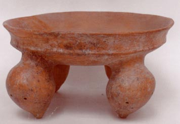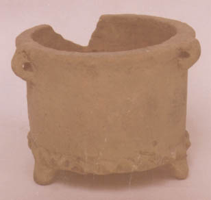 Urna de pared recta, borde plano, base trípode. Decoración: dos asas que salen del borde, soportes cónicos, pestaña basal con diseño de hendiduras.