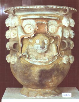 Urna de pared curvo divergente, base pedestal, borde evertido. Decoración: jaguar emergiendo de las fauces de un monstruo de ojos grandes, pupilas en forma de bastón, a cada lado del monstruo, dos filas verticales de 7 calaveras, la urna lleva ocho asas, cuatro del borde a la pared y cuatro alrededor de la pared. Antigua…